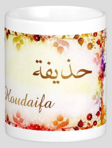 Mug avec le prénom "Houdaifa" écrit en français, en arabe (حذيفة) et calligraphié de façon artistique en arabe sur la partie droite.