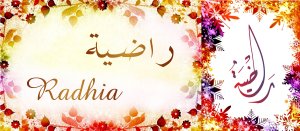 Signification (sens) du prénom Râdiya (Radia, Radiya, Radhia) رَاضِيَة: Assouvie, apaisée, acceptante, réjouie et heureuse. Râdiya, surnom de Fâtima, la fille du Prophète Muhammad.