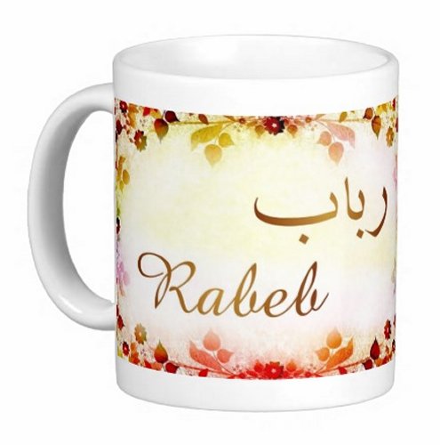 Mug avec le prénom "Rabeb" écrit en français, en arabe (رباب) et calligraphié de façon artistique en arabe sur la partie droite.