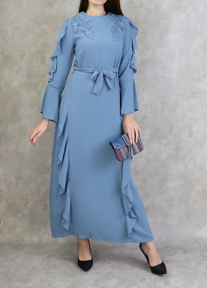 Robe longue, col rond, fermeture éclair au dos, broderies sur les épaules, manches longues, poignets évasés, ceinture assortie à passants. Coupe droite, tissu fluide et opaque, finitions froufrous sur les manches et la longueurs.