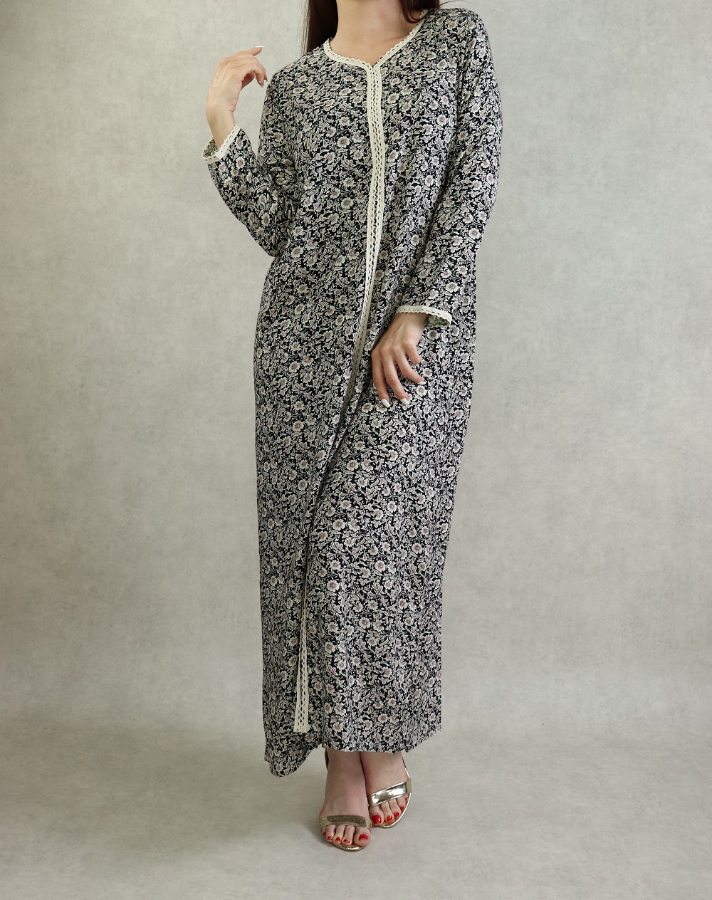 Robe longue, tissu léger de type soie (rayonne), imprimé floral, Col en V, manches longues. Ce modèle est décorée d'une fine broderie sur toute la longueur ainsi que sur les manches.