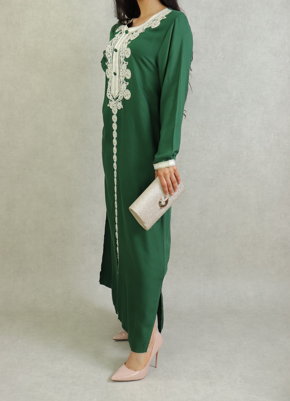 Robe orientale longue, style caftan algérien, avec broderie et strass sur toute la longueur. Le double avantage de ce modèle est d'être confortable et élégant à la fois.
