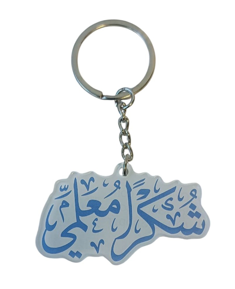 Porte clé "Choukran Mou'alimmî" (Merci professeur شكرا معلمي) écrit en calligraphie arabe.