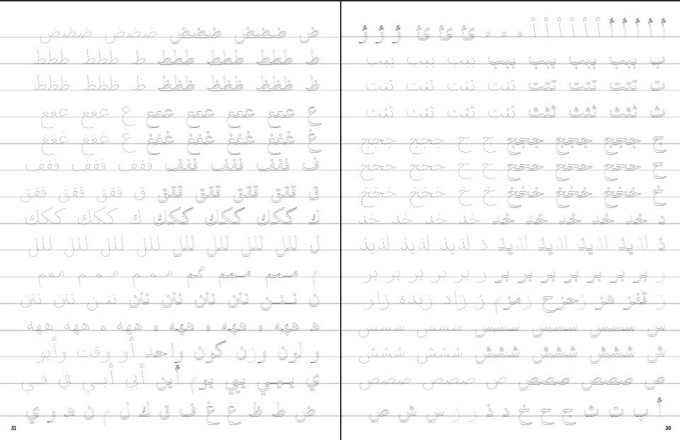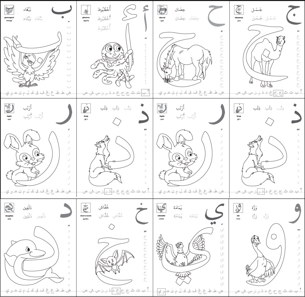 On retrouve, à la fin du livre, des pages d’écriture des lettres arabes avec leurs différentes formes (isolées, initiales, médianes et finales), ainsi que des mots simples combinant les lettres pour renforcer son apprentissage.