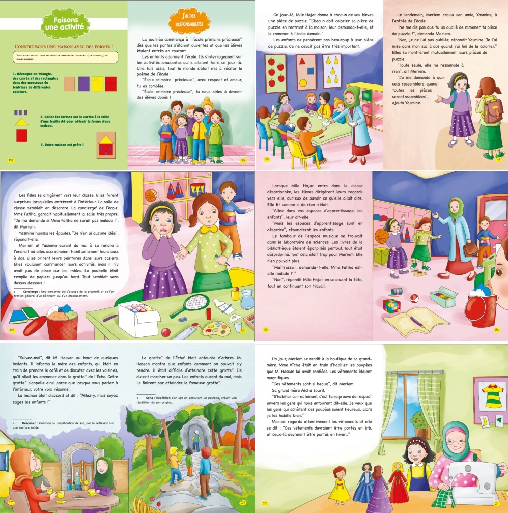 Chaque chapitre du livre repose sur un enseignement prophétique, qui met en scène le comportement exemplaire du Prophète Mohamed ﷺ, étayé par un hadith dont la référence est précisée en note de bas de page. Chaque chapitre est aussi suivi d’activités interactives et de travaux manuels qui ancrent ces leçons précieuses dans la vie quotidienne de nos enfants.