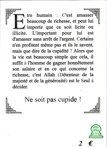 Accessoires divers - Alimentation Halal - Apprentissage anglais - Apprentissage arabe - Apprentissage français - Apprentissage langues - Art & Culture - Artisanat & décoration - Beauté, Soins naturels - Bien-être - Biographies - Calligraphie - Chants (Nachids) - Compagnons - Comprendre l'Islam - Contes & histoires - Cours & Conférences - Cuisine - Culture berbère - Da'wa (Prédication) - Dicos & encyclopédies - Divers - Dogme ('Aqîda) - Economie & finance - Education - Electronique - Enfants - Ethique - Exhortation - Femme - Fondements du droit - Hadiths - Histoire & civilisations - Histoires du Coran - Idées Cadeaux - Informatique - Initiation à l’Islam - Interprétation rêves - Invocations (dou'â) - Islam & laïcité - Islam & Occident - Islam & Sciences - Islam contemporain - Jeûne (Ramadan) - Jeunesse - Jurisprudence - Littérature & poésie - Ludoéducatif - Mariage & Couples - Monde arabe - Mystique & Soufisme - Paradis - Enfer - Mort - Pèlerinage & ‘Omra - Philosophie - Politique & Géopol. - Pratique religieuse - Prénoms - Prêt-à-porter Femmes - Prêt-à-porter Hommes - Prophètes - Religions du Livre - Revues & Guides - Roqya & protection - Saint Coran - Santé & Diététique - Sciences du Coran - Sciences du Hadith - Société & Traditions - Sounna du Prophète - Spiritualité - Tafsîr (Exégèse) - Tajwîd (Règles) - Tourisme - Vie du Prophète saw - Zakat & aumône