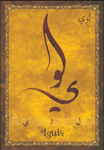 Jolie carte postale représentant le prénom français Louis calligraphié en arabe ainsi que son épellation lettre par lettre en arabe. Derrière la carte postale se trouve la signification du prénom. Prénom d'origine germanique signifiant illustre combattant.