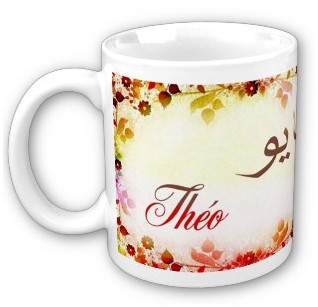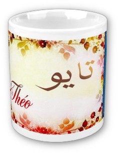 Mug avec le prénom "Théo" calligraphié en arabe (تايو) ainsi que son épellation lettre par lettre en arabe.