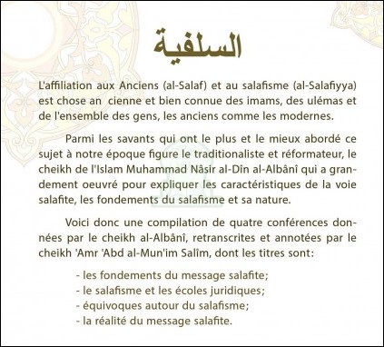 Le Salafisme, du Mythe à la Réalité. Fondements, Équivoques, Positions, Vérités. L'affiliation aux anciens (al-salaf) et au salafisme (al-salafiyya) est chose ancienne et bien connue des imams, des ulémas et de l'ensemble des gens, les anciens comme modernes. Parmi les savants qui ont le plus et le mieux abordé ce sujet à notre époque figure le traditionaliste et réformateur, le cheikh de l'Islam Muhammad Nasir al-Din AL-ALBANI qui à grandement œuvré pour expliquer les caractéristiques de la voie salafiste, les fondements du salafisme et sa nature.
