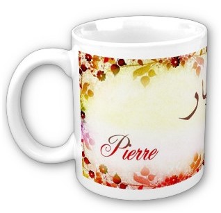 Mug avec le prénom "Pierre" calligraphié en arabe (بيار) ainsi que son épellation lettre par lettre en arabe.