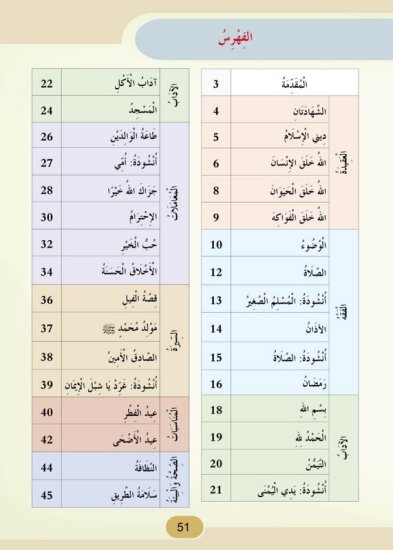القرآن الكريم: يحتوى الكتاب على بعض سور القرآن الكريم من جزء عم بحيث توفر على التلميذ عناء حمل المصحف معه