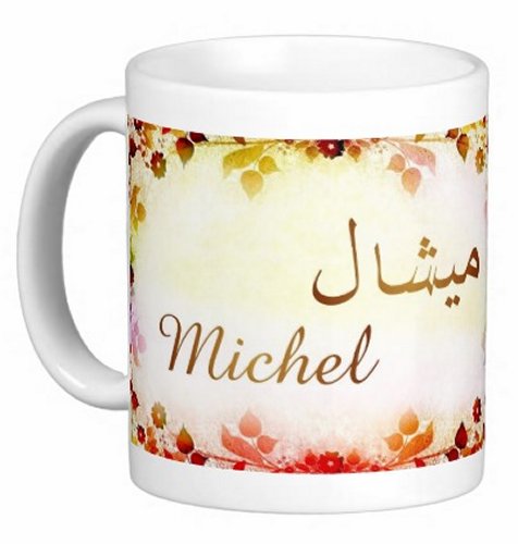 Mug avec le prénom "Michel" écrit en français, en arabe (ميشال) et calligraphié de façon artistique en arabe sur la partie droite.