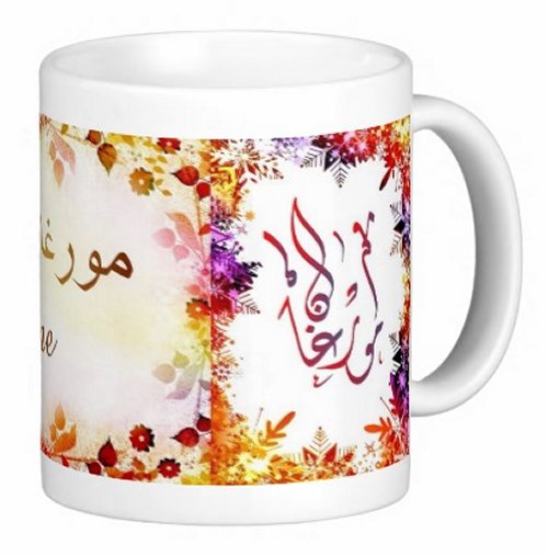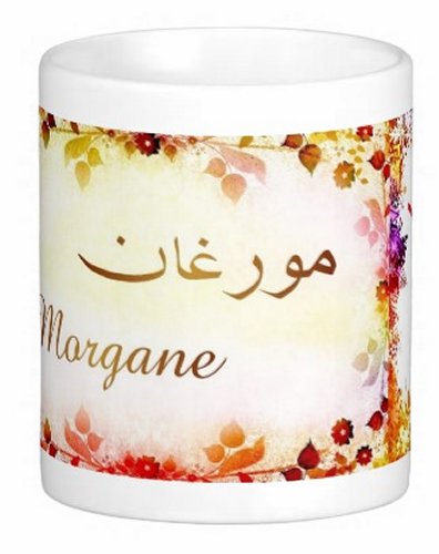 Mug avec le prénom "Morgane" écrit en français, en arabe (مورغان) et calligraphié de façon artistique en arabe sur la partie droite.