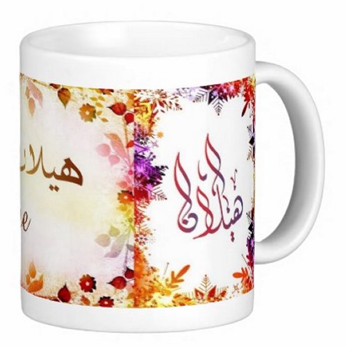 Mug avec le prénom "Hélène" écrit en français, en arabe (هيلان) et calligraphié de façon artistique en arabe sur la partie droite.