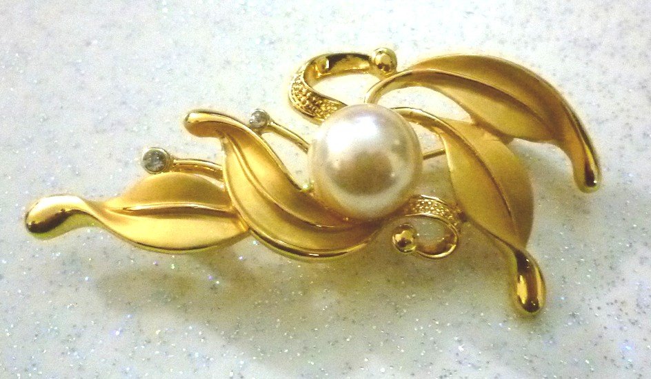 Broche pour Hijab dorée en forme de petites feuilles, agrémentée de pierres diamantées et d'une grosse perle blanche au milieu.