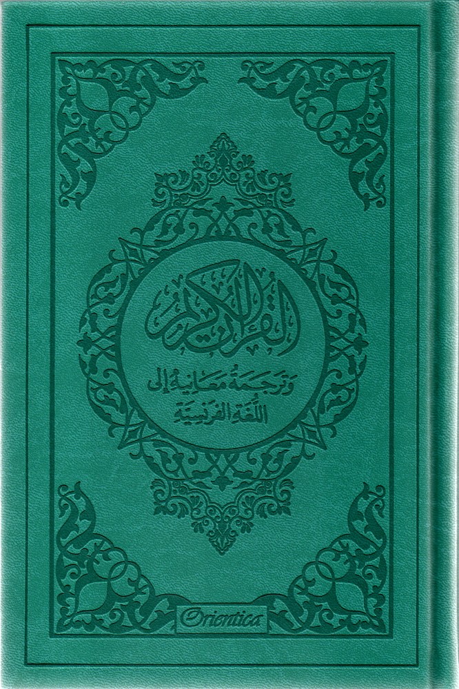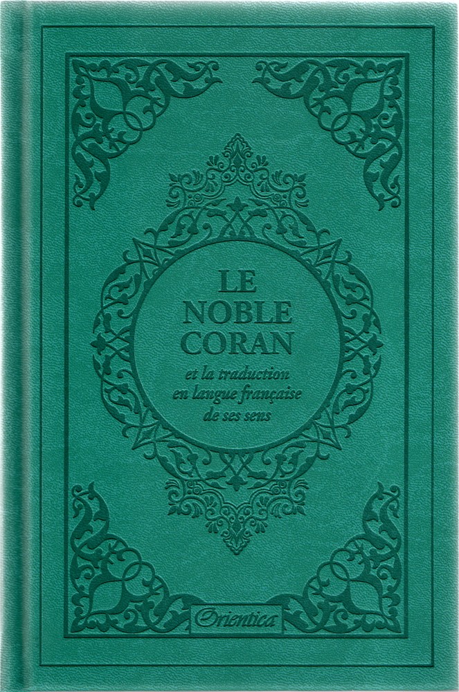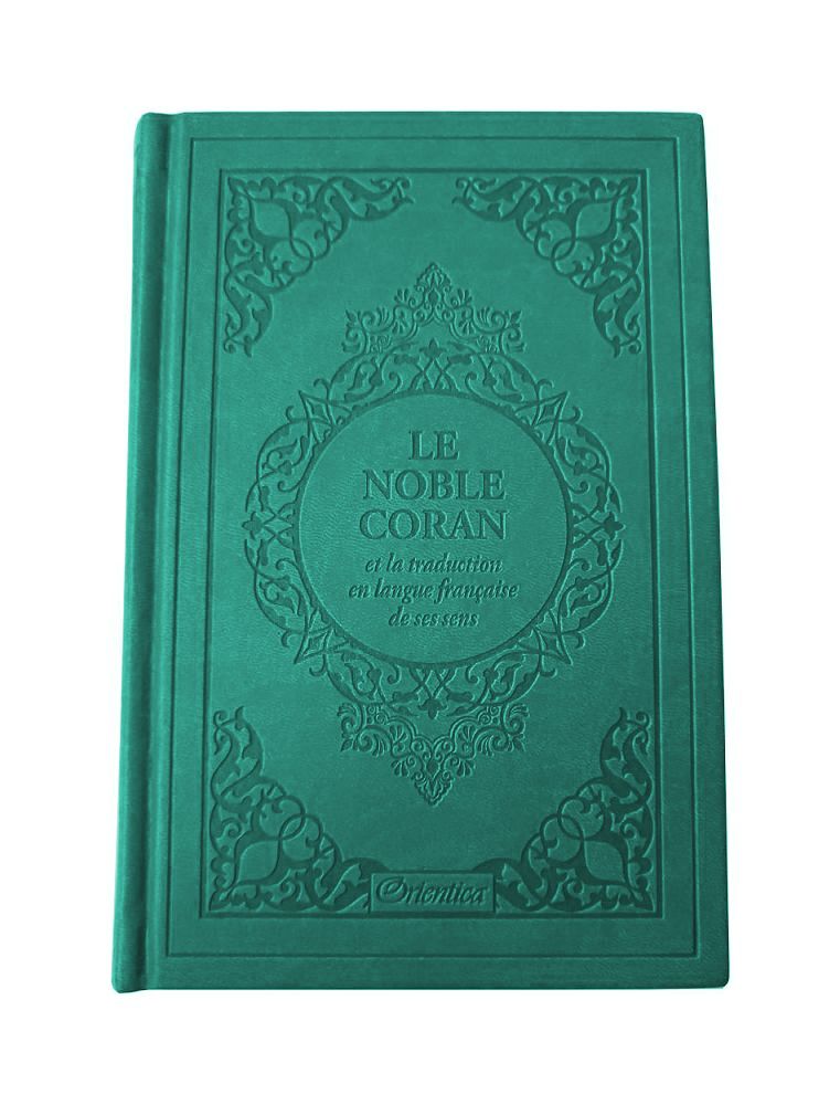 Le Noble Coran avec couverture cartonnée de type cuir, doux au toucher. Très jolie couleur bleu-vert. Idéal pour offrir.