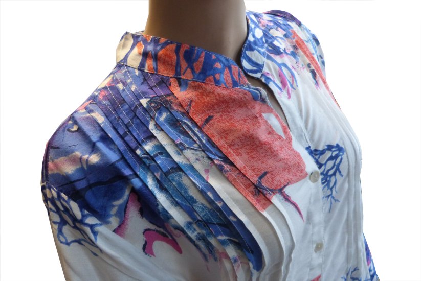 Chemise-tunique blanche a motifs bleus fuchias et corail