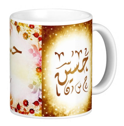 Mug avec le prénom "Hussein" écrit en français, en arabe (حسين) et calligraphié de façon artistique en arabe sur la partie droite.