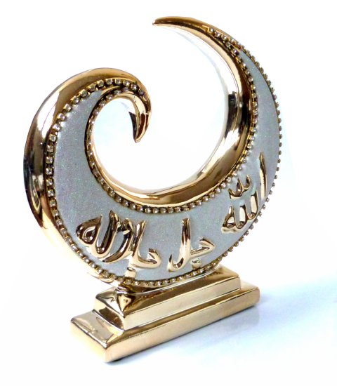 Objet décoratif en porcelaine dorée avec calligraphies Allah - Muhammad (SAW) décoré de jolies émeraudes blanches - REF. 23402 (25.00 €) - En Promotion à 18.00 €