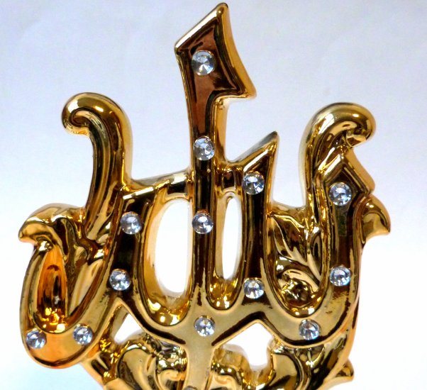 Objet decoratif en porcelaine doree avec calligraphie Allah decore de diamants