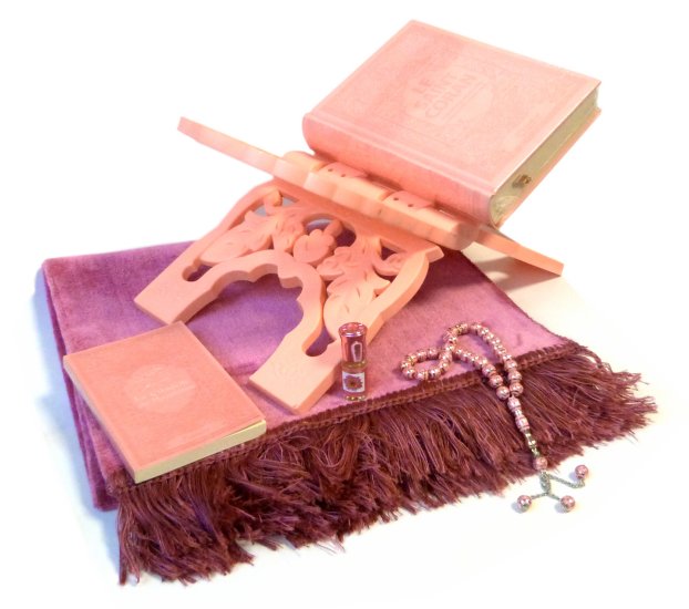 Un cadeau original qui ne passera pas inaperçu. Le Coran, le porte Coran, la Citadelle et le chapelet sont exactement de la même couleur (rose pale).