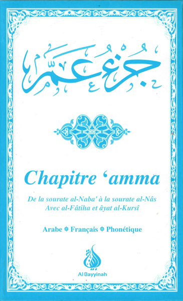 Ce livre au format de poche contient le chapitre 'Amma (Juz' 'Amma - جزء عم), de la sourate Al-Naba(78) à la sourate Al-Nâs(114) avec la sourate Al-Fâtiha et âyat Al-Kursî, en arabe, français et phonétique,avec une couverture bleue et des pages imprimées bicolores.