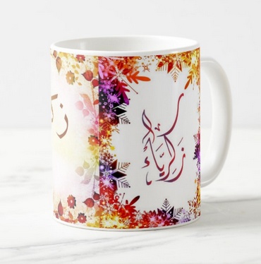 Mug avec le prénom "Zakariya" écrit en français, en arabe (زكرياء) et calligraphié de façon artistique en arabe sur la partie droite.