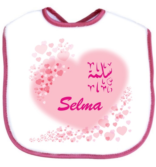 Bavoir pour bébé avec prénom personnalisé en arabe et/ou français inscrit au milieu d'un grand coeur rose. Excellente idée cadeau pour une naissance.