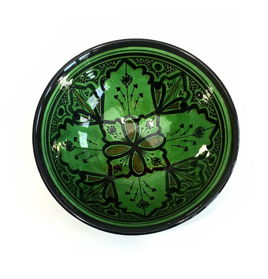 Grand bol en poterie marocain de couleur vert foncé émaillé et cerclé de métal argenté - REF. 29174 (7.50 €)
