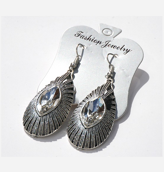 Boucles d'oreilles pendantes en métal argenté ciselé serties de pierres blanc Vetement & Accessoire