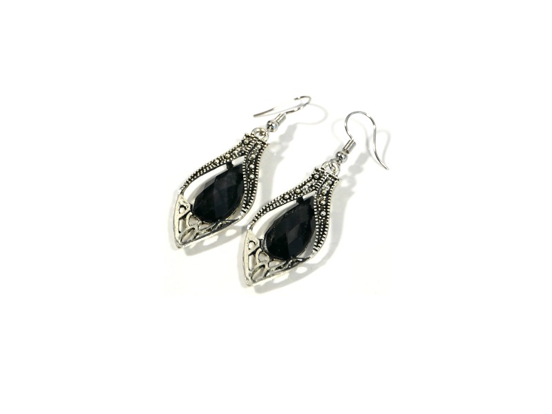 Boucles d'oreilles pendantes en métal argenté ciselé serties de pierres noir - REF. 29554 (5.90 €)