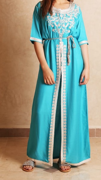 Un beaux Caftan traditionnelle marocaine, entièrement brodée à la main par des artisans marocains qualifiés. Coupe évasée, tissu fluide et doux au toucher (coton), est fournie avec une ceinture.