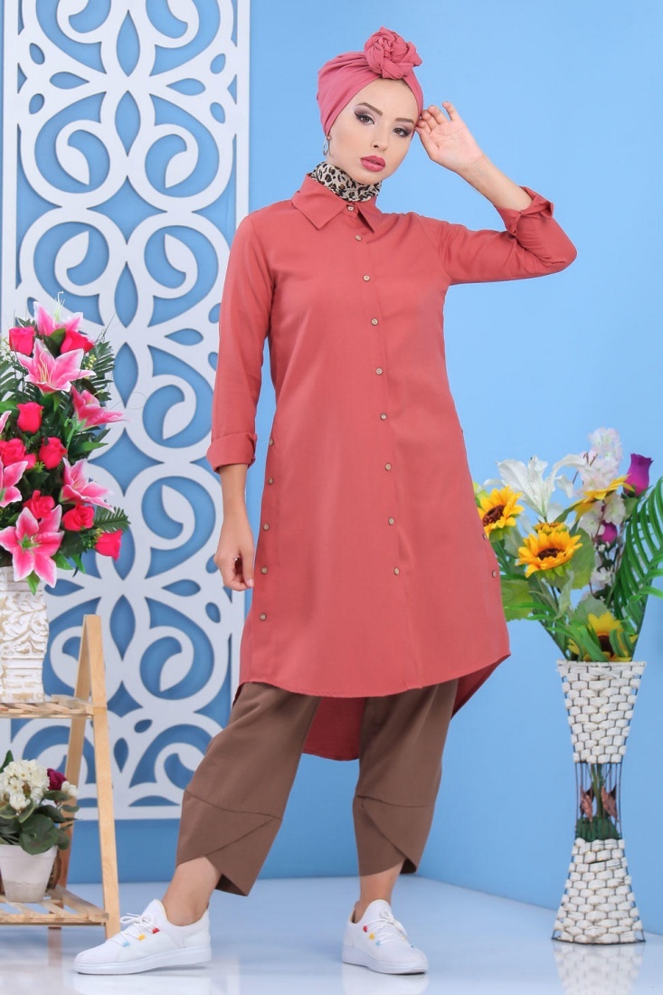 Chemise-Tunique ample à manches décorées (Vêtement chic femme voilée Paris) - Couleur kaki et brique - REF. 38588 (24.90 €)