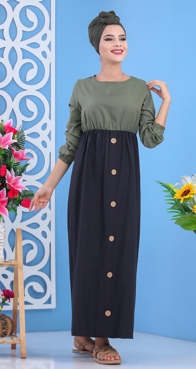 Robe longue bicolore a boutons pour femme - Couleur kaki