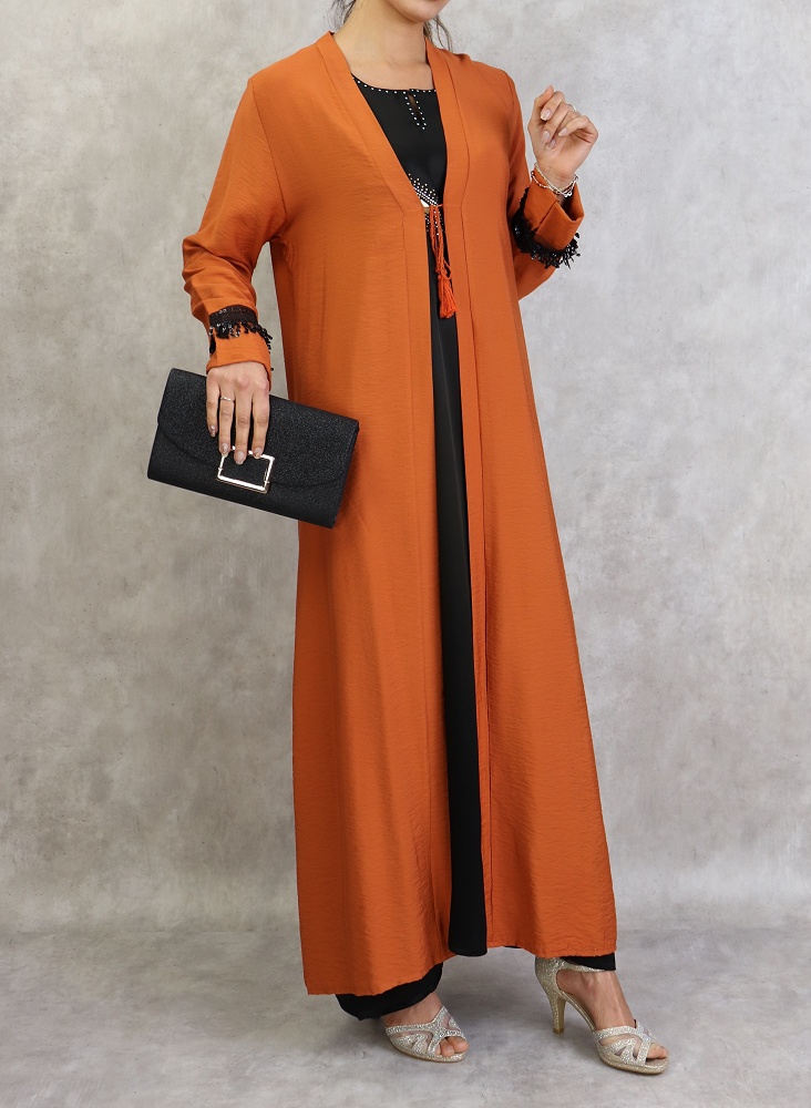 Kimono long Dde couleur rouille avec décorations franges noires Vetement & Accessoire