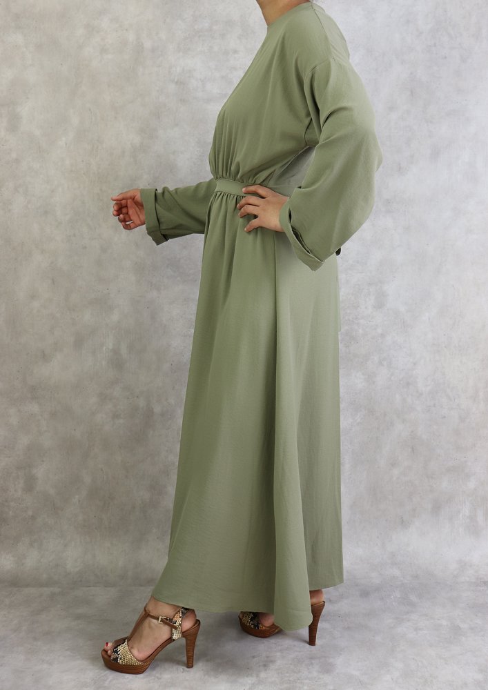 Robe de couleur unie, fluide est ornée de fronces. Deux liens qui peuvent aussi bien se nouer à l’avant comme à l'arrière afin d'obtenir un effet cintré. Coupe arrondie et taille resserrée pour cette robe longue à manches évasées et larges.
