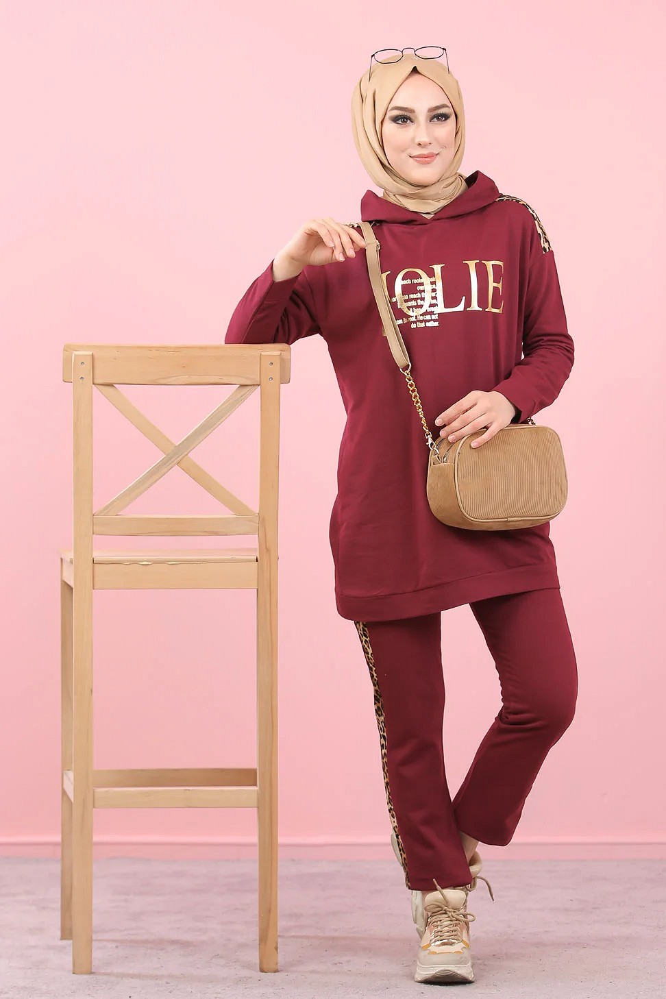 Survêtement femme motif panthère Tunique à capuche et Pantalon imprimé "Jolie" doré (Hijab Sport) - Couleur bordeaux Foncé Vetement & Accessoire