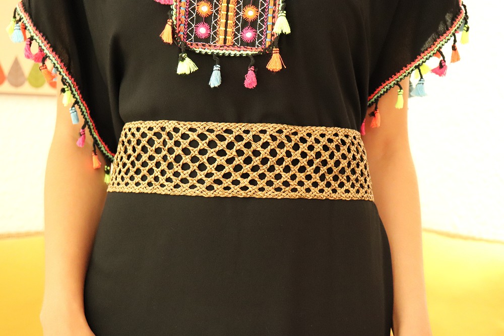 Ceinture large à motifs croisés, fermeture à l'aide de 2 liens tressés.