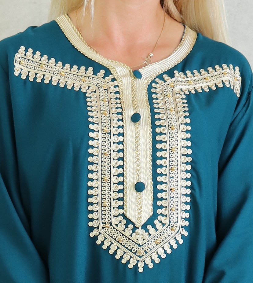 Robe orientale maghrébine longue brodée et perlée pour femme - Couleur bleu Prusse Vetement & Accessoire
