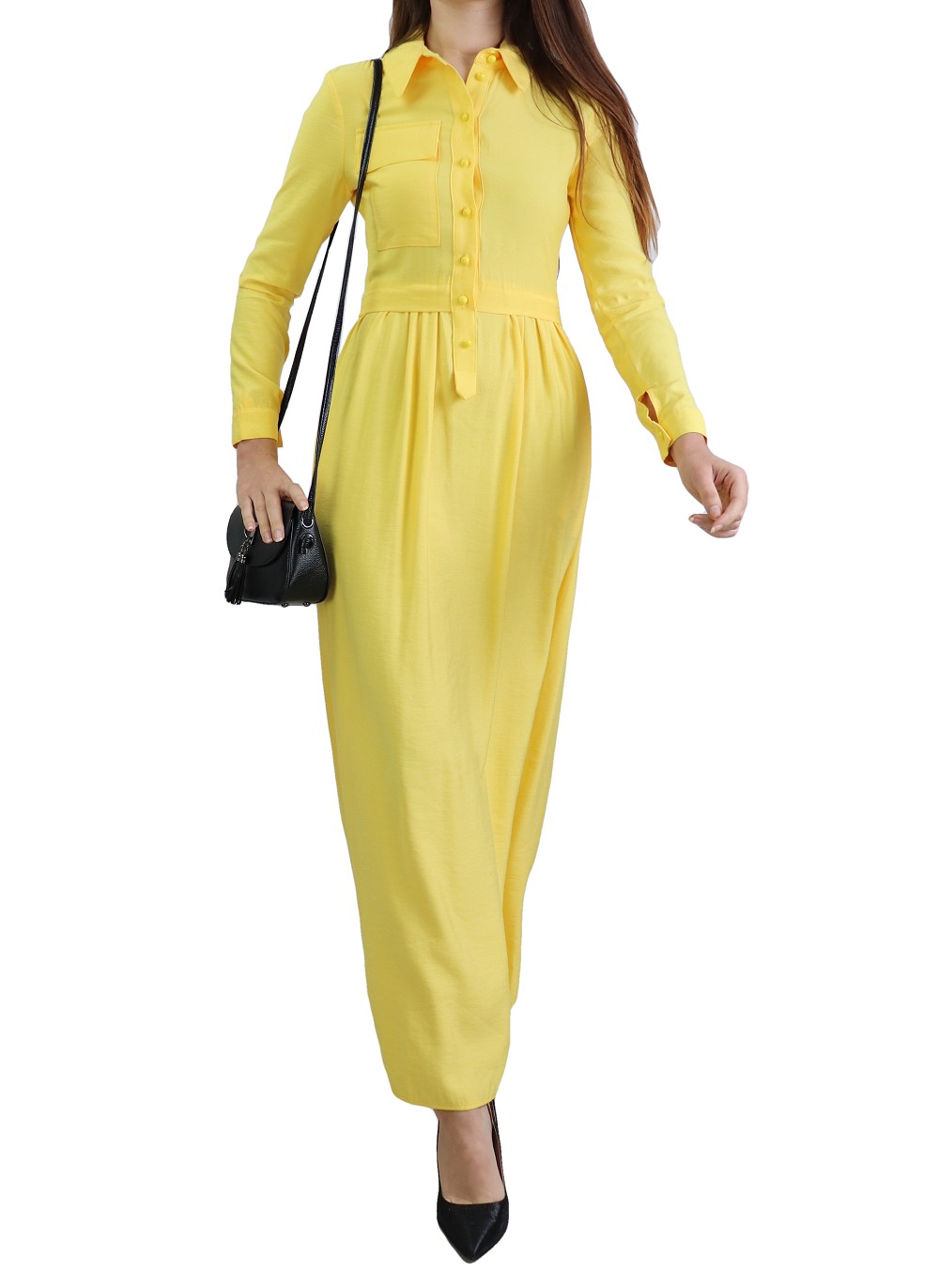 Robe casual longue boutonnée évasée pour femme - Couleur Jaune Vetement & Accessoire