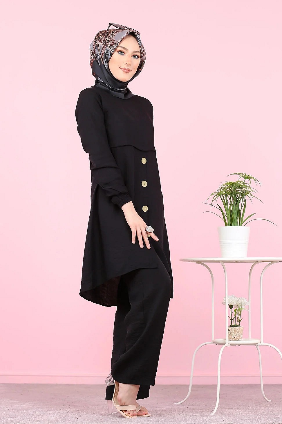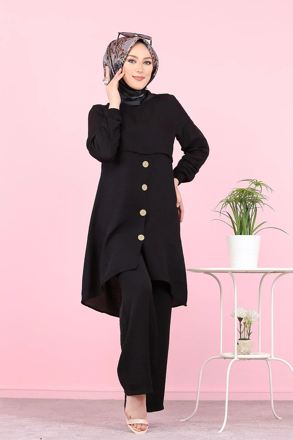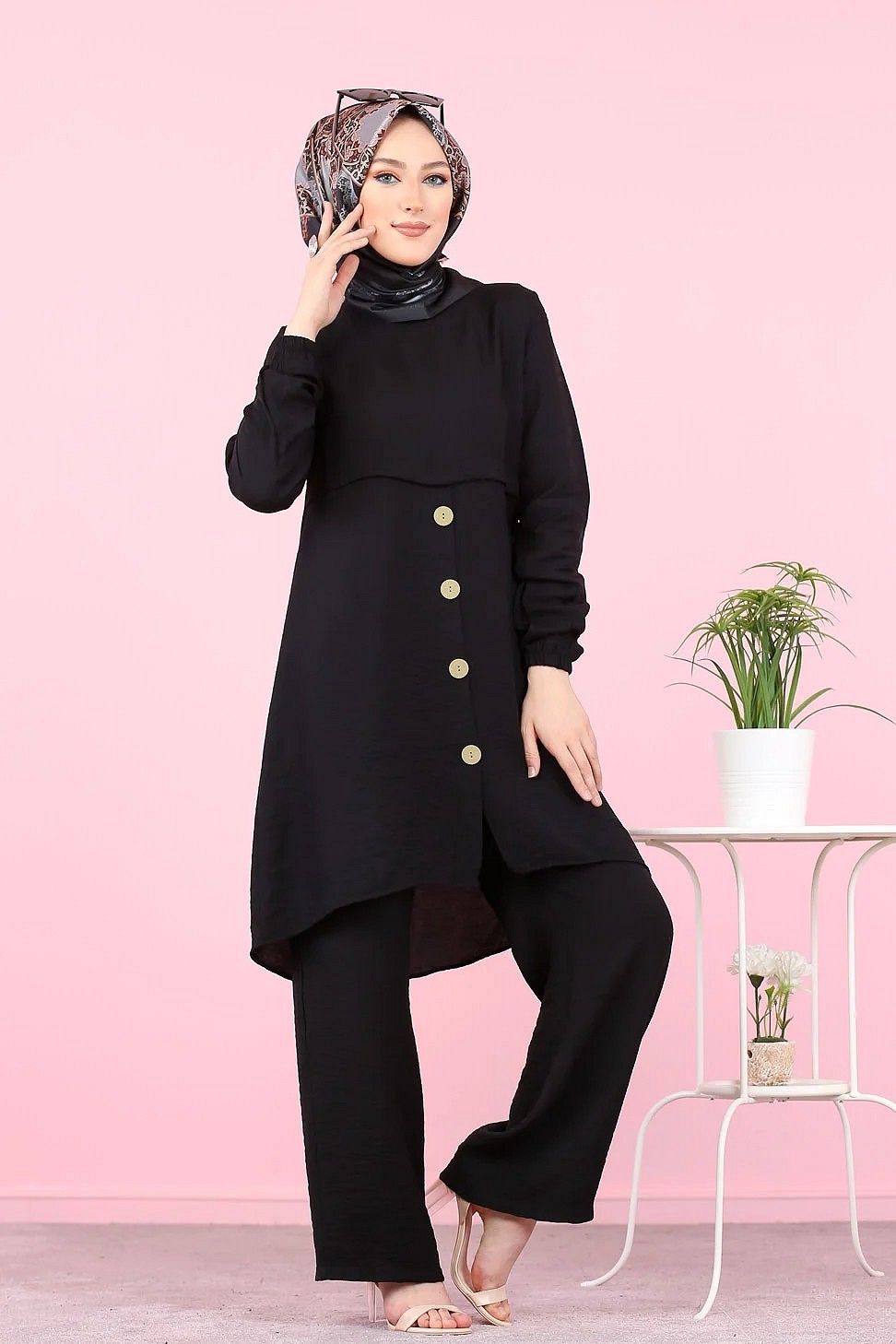 Ensemble casual moderne noir : Tunique boutonnée - chemise longue et son pantalon - Vêtement Hijab ample pour femme