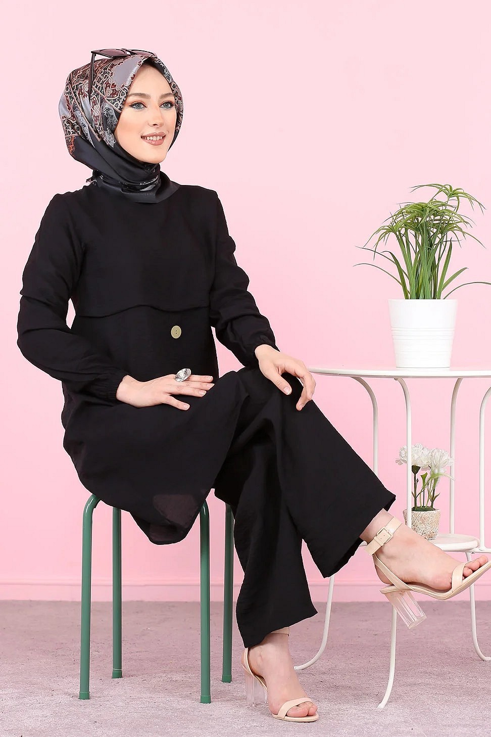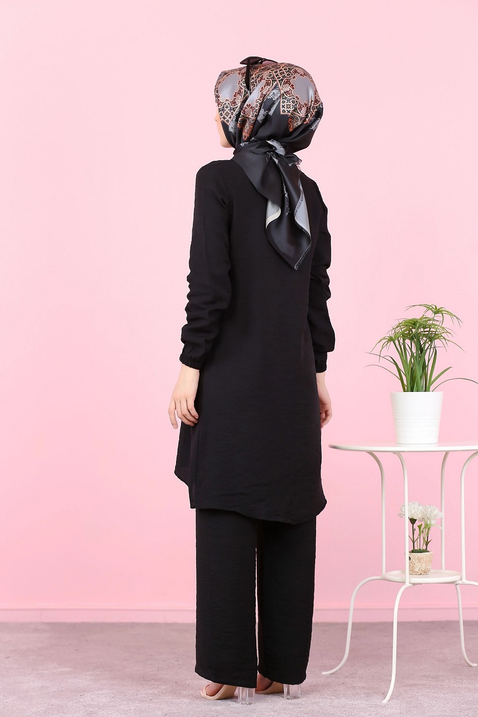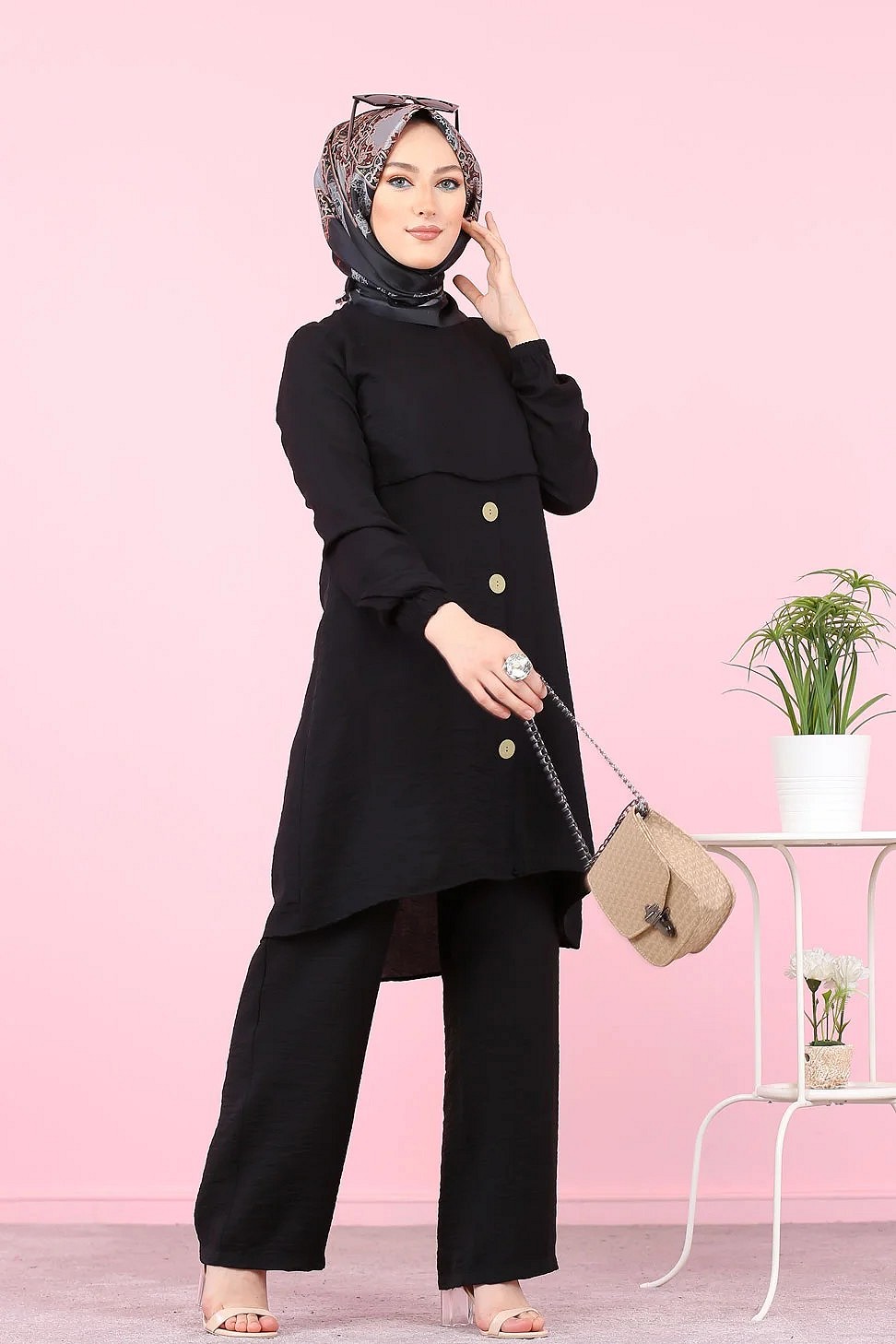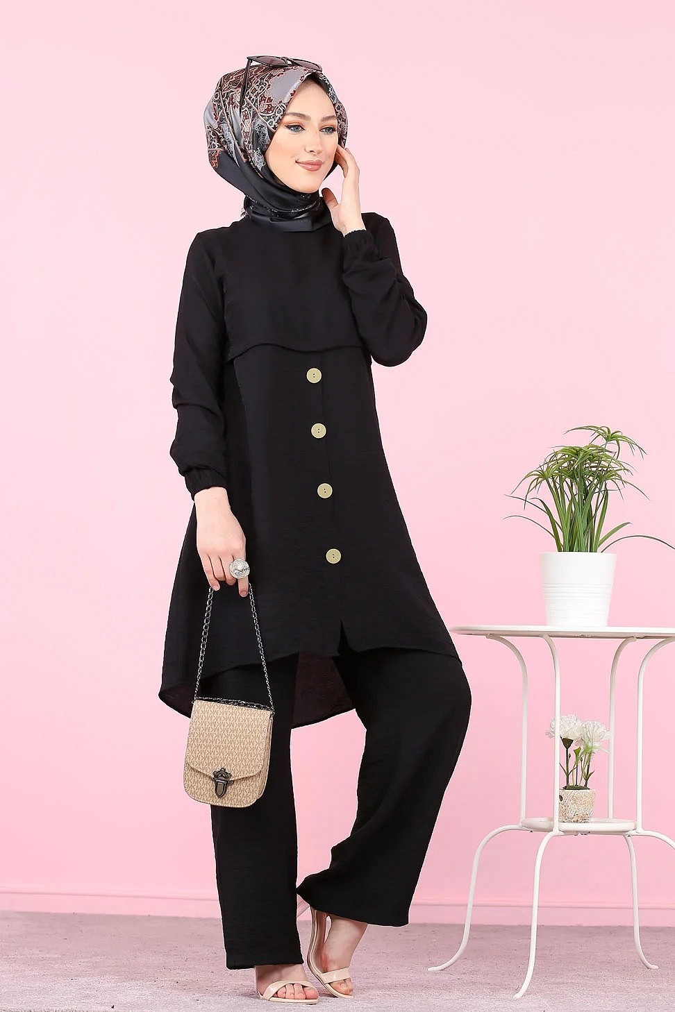 Ensemble casual moderne noir : Tunique boutonnée - chemise longue et son pantalon - Vêtement Hijab ample pour femme