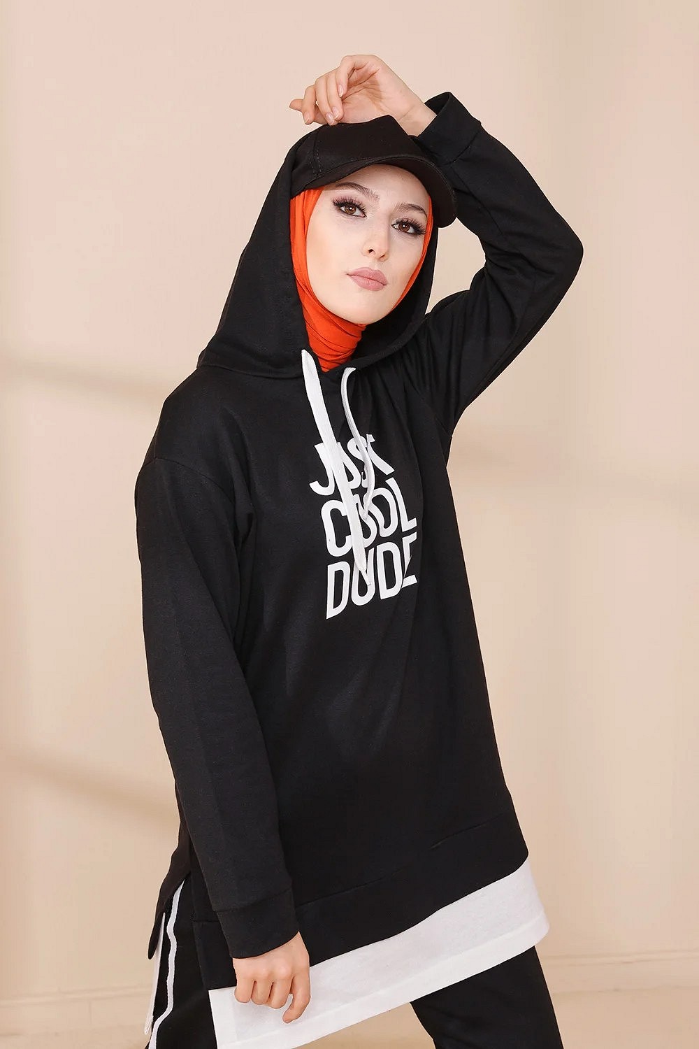 Survêtement avec extension blanche - Ensemble Sweat à capuche imprimé "Just Cool Dud" (Boutique Musulmane Hijab - hidjab - hijeb - turban) - Couleur noir Vetement & Accessoire