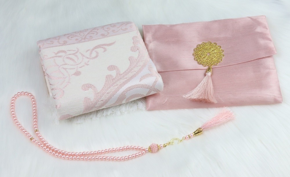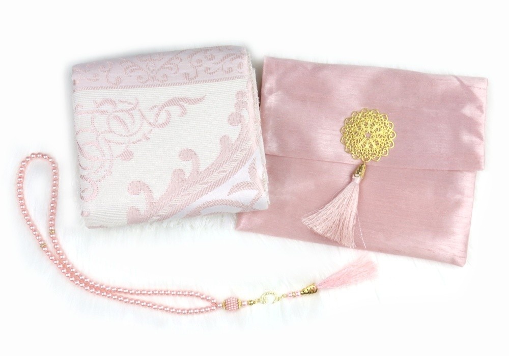Coffret/Pack cadeau prière pour femme : Tapis rose, Coran luxe rose, Porte Coran, Diffuseur de parfums, parfum Musc d'Or et chapelet perles - REF. 21951 (45.00 €)
