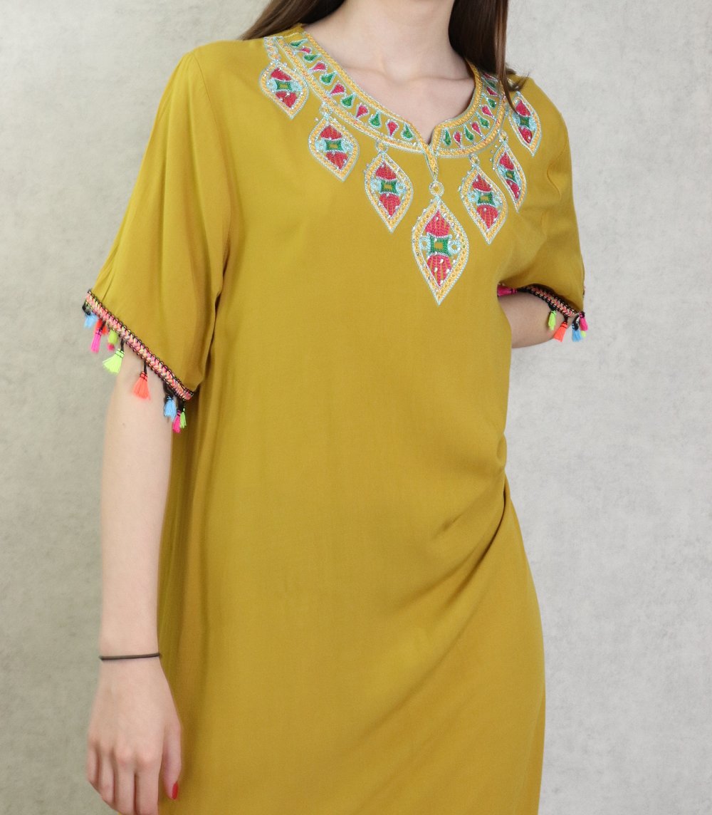Robe longue fluide et confortable avec broderies et strass pour femme - Couleur moutarde Vetement & Accessoire