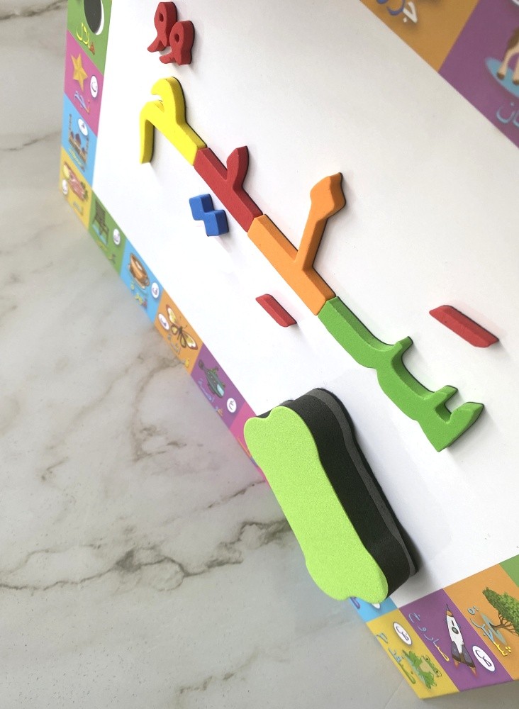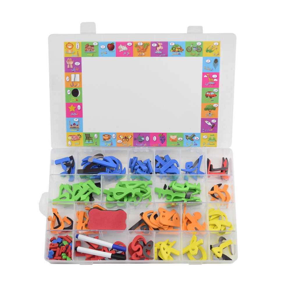 Cette mallette contient un très grand nombre de lettre et voyelles arabes magnétiques qui peuvent se fixer très facilement sur le tableau, avec toutes les combinaisons possibles afin de constituer les mots que l'on veut... Les points et les voyelles (tachkîl) sont également fournies seuls afin d'avoir encore plus de flexibilité et de possibilités d'écritures...