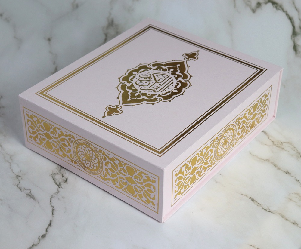 Grande boite cadeau rigide (cartonnée) avec fermeture magnétique et inscription "Le Saint Coran" en arabe calligraphique (القرآن الكريم) - Couleur rose clair doré.