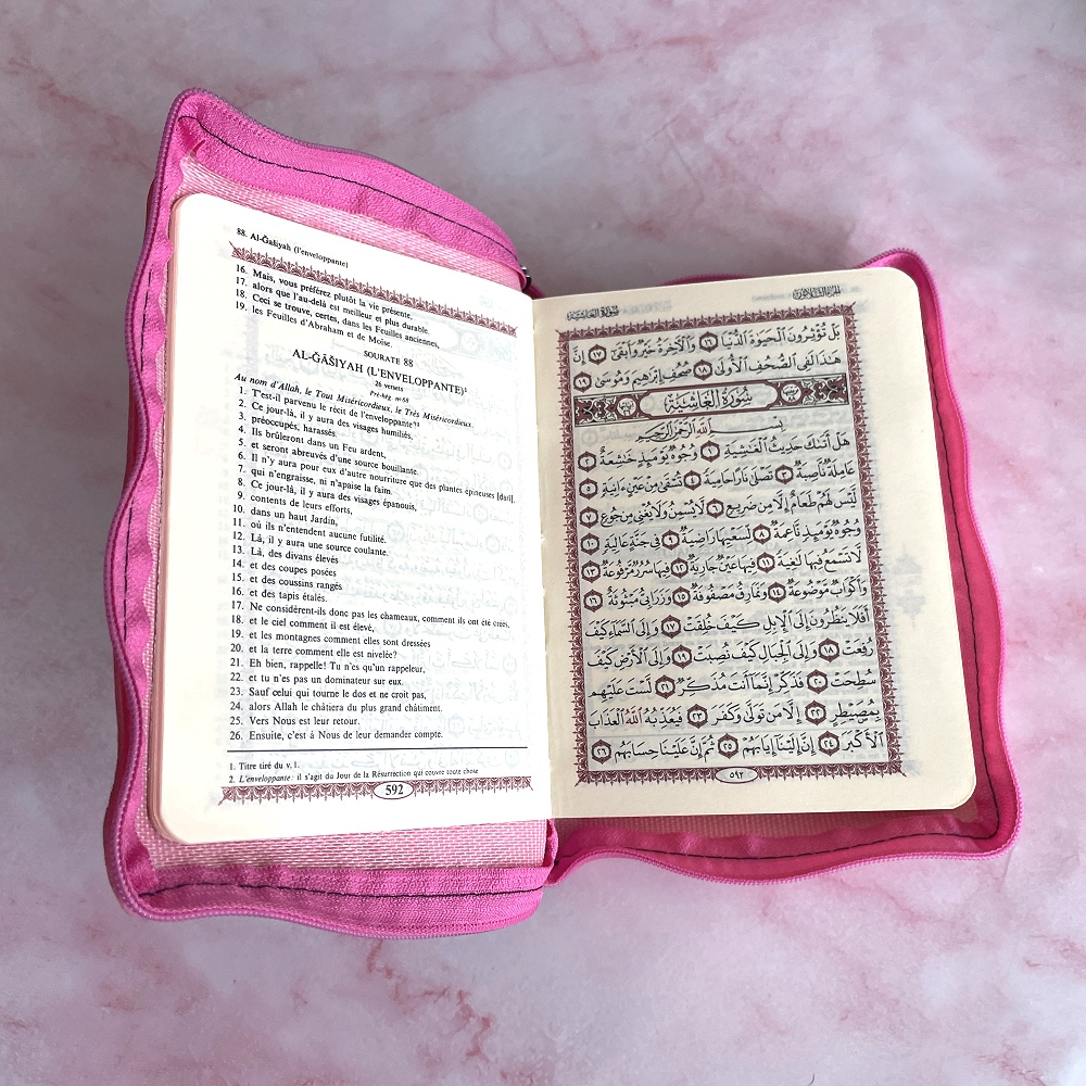 Le Saint Coran de poche bilingue (arabe-francais) avec pochette fermeture zip (10 x 14 cm) - Rose