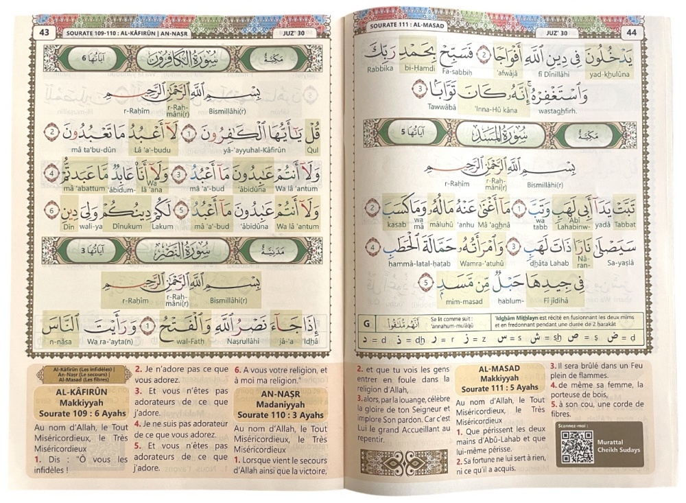 Découvrez nos nouveaux Coran Chapitre Amma (Jouz' 'Ammâ جزء عم) exceptionnels adaptés aux personnes non arabophones (ou débutants en arabe) désirant apprendre la lecture et la prononciation correcte du Saint Coran de façon simple et intuitive.
