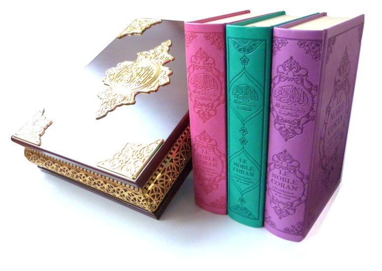 Noble Coran avec sa couverture en cuir, traduit en langue française avec son coffret doré de luxe assorti.